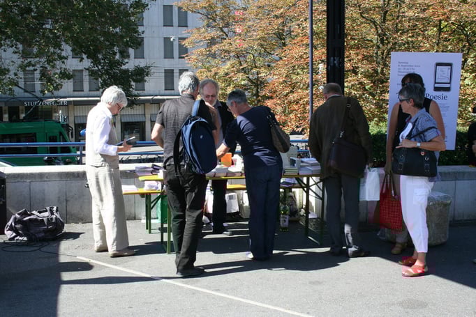 Bei schönstem Sommerwetter fand am Samstag, 8. September 2012 der erste, reaktivierte Tag der Poesie statt. Zeitgenössischer Lyrik und Werken aus früheren Epochen in einer technisierten, beschleunigten Welt, deren neueste Errungenschaften den Rang des Buches und den des ästhetischen Sprachgebrauchs in der Gesellschaft bedrohen, öffentlichen Raum zu verschaffen, ist das Ziel des Aktionstages, der nach gut Zwanzig Jahren vom neu gegründeten Verein Poesietag erstmals wieder durchgeführt wird.